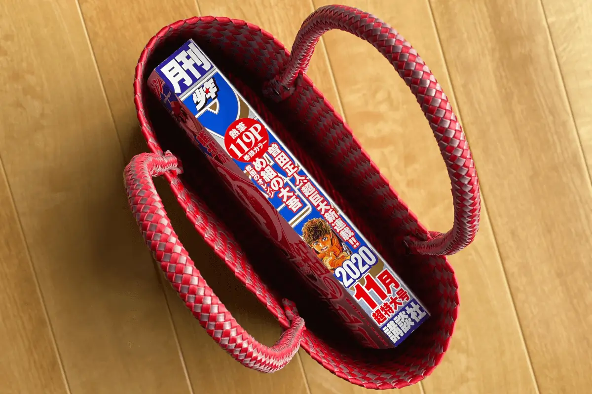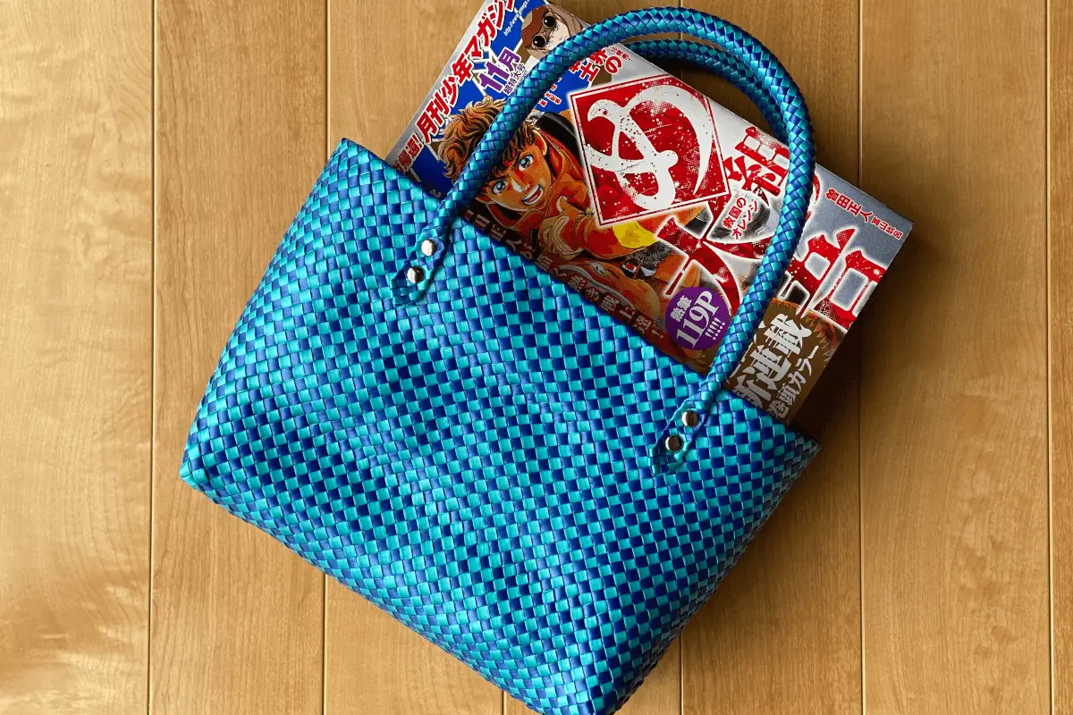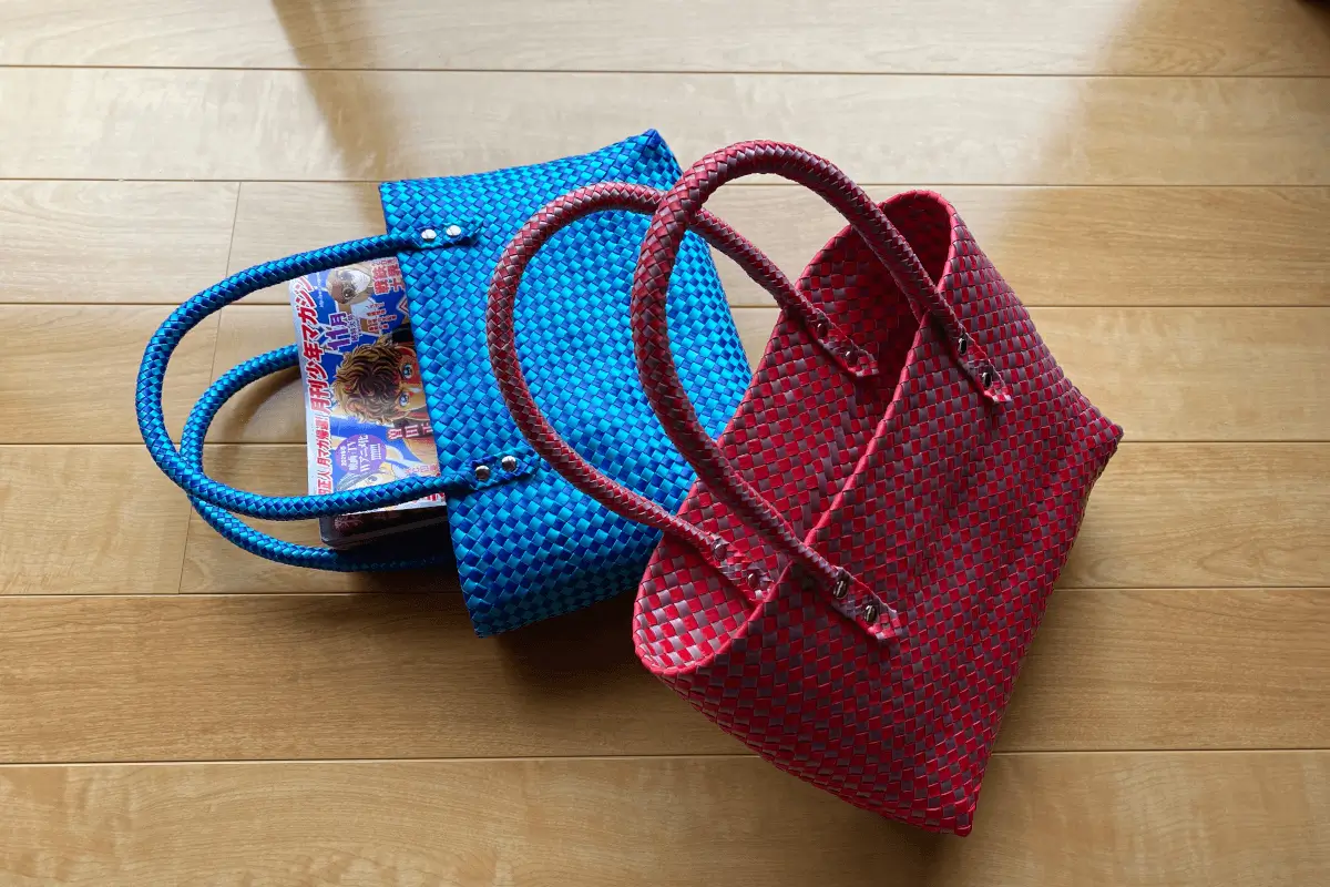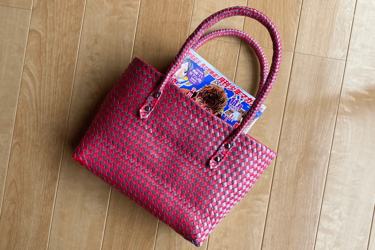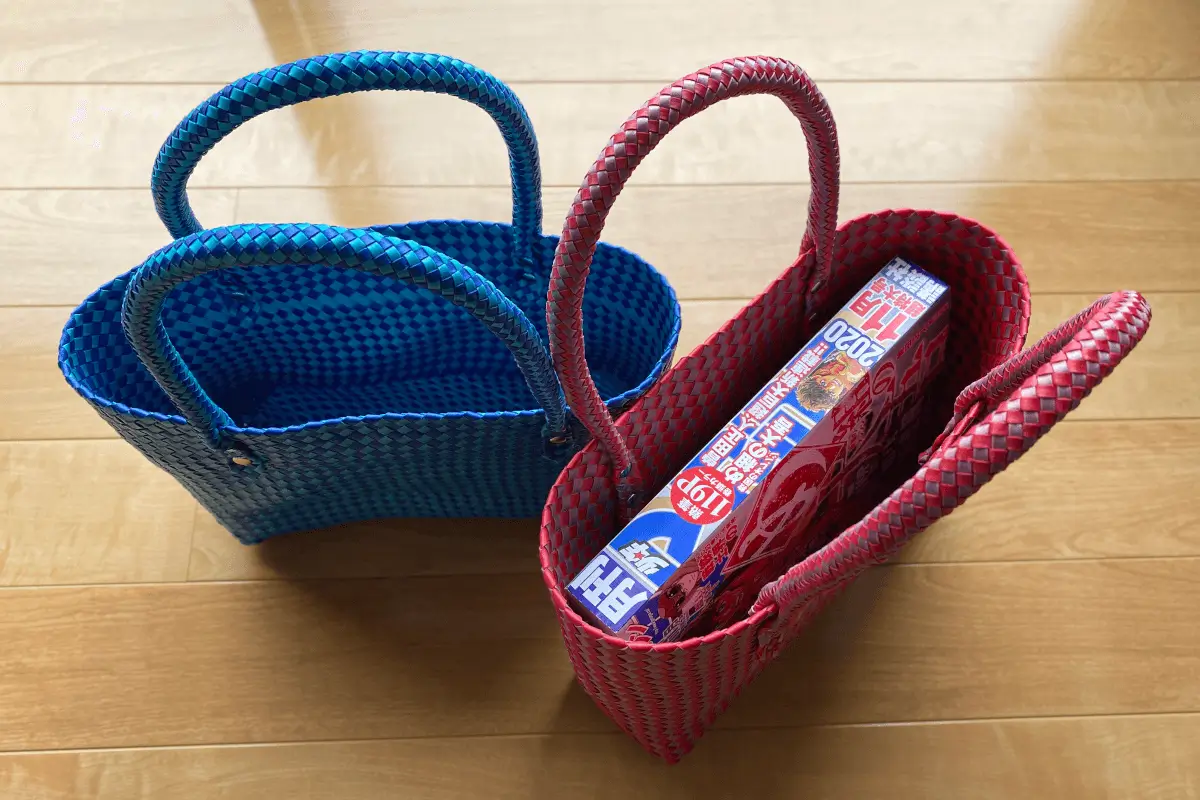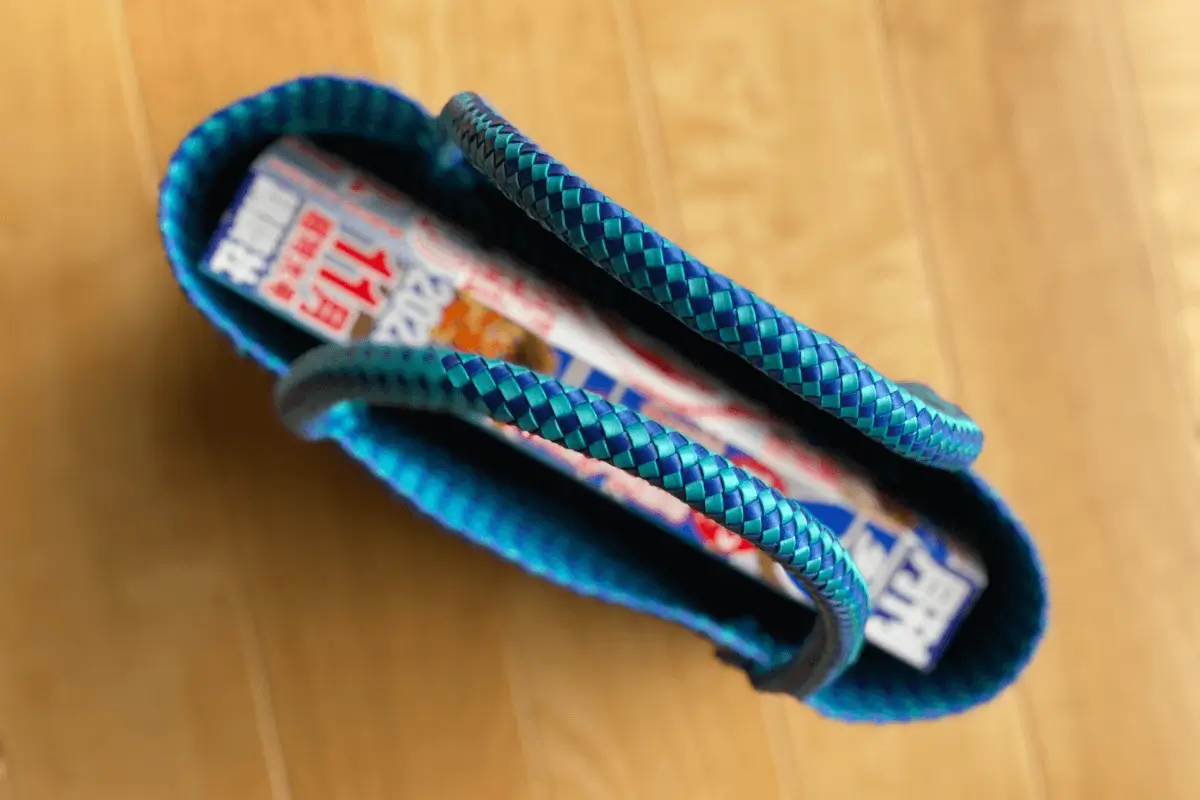 Note that the knitting method for the handles this time is a combination of 12-strand circular knitting, 6-strand circular knitting and barley straw? with the material being 4 mm wide. A combination of flat knitting, a method that anyone can use. I wondered if the material would be brittle in narrow weaving (as I felt a cutting sensation when tightening). I wondered if the material would be brittle, but I was able to weave it in without problems and learned about the possibilities of narrow weaving in the future.