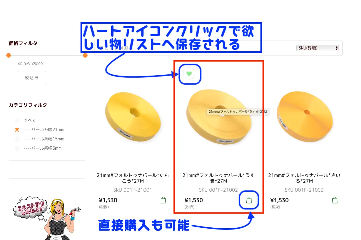 この修正により”商品一覧(サムネ画像)”内等でも商品説明に出向く必要なく、そのまま欲しい物リスト(ウィッシュリスト)が利用が可能になります。またこの修正に合わせてアイコンやカラーを若干変更しました。