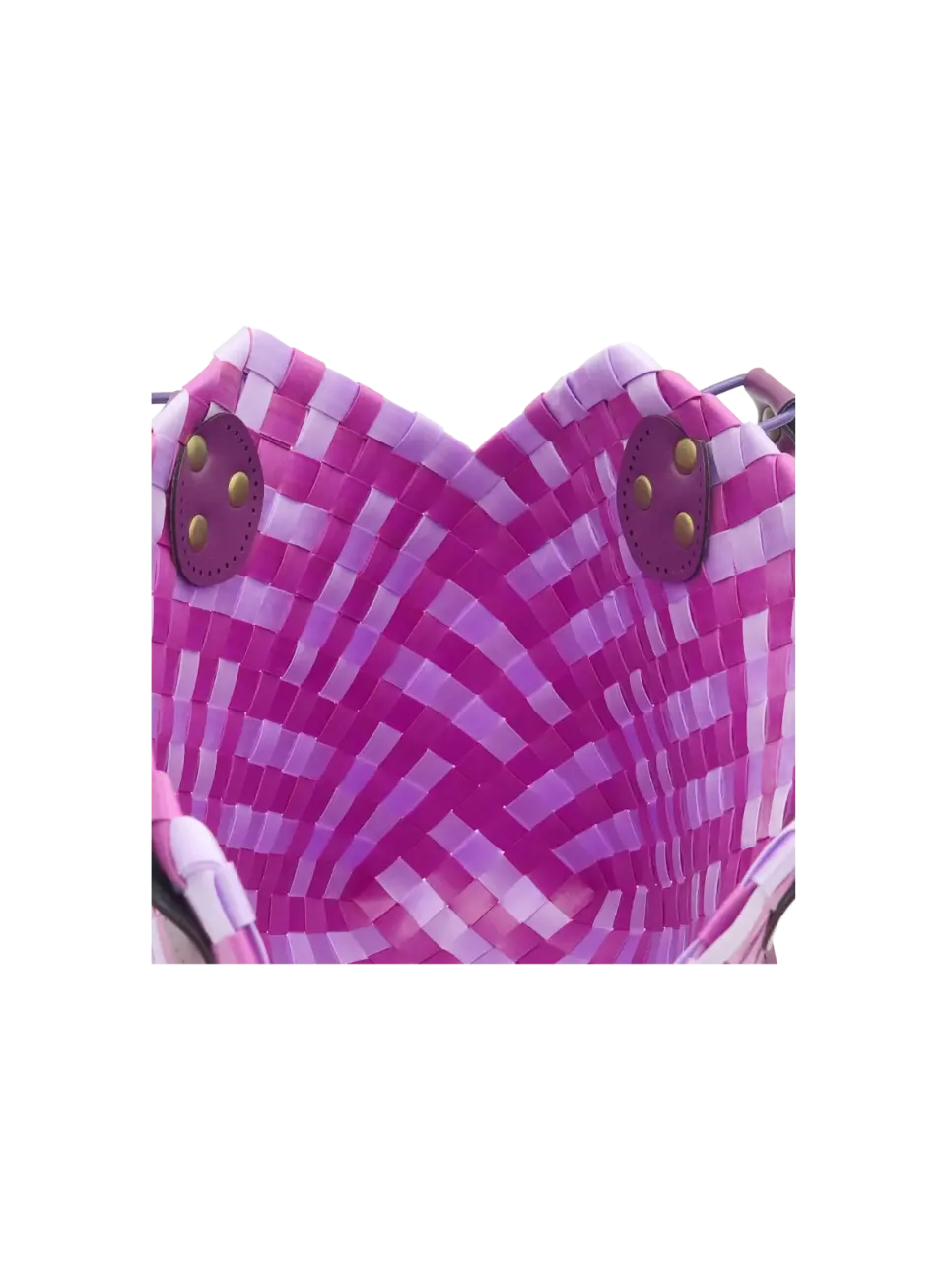 - この試作品のハンドル(持ち手)には、INAZUMAの合成皮革YAK-590(全長約46cm、太さ約1cm、色はパープル)を使用しました。